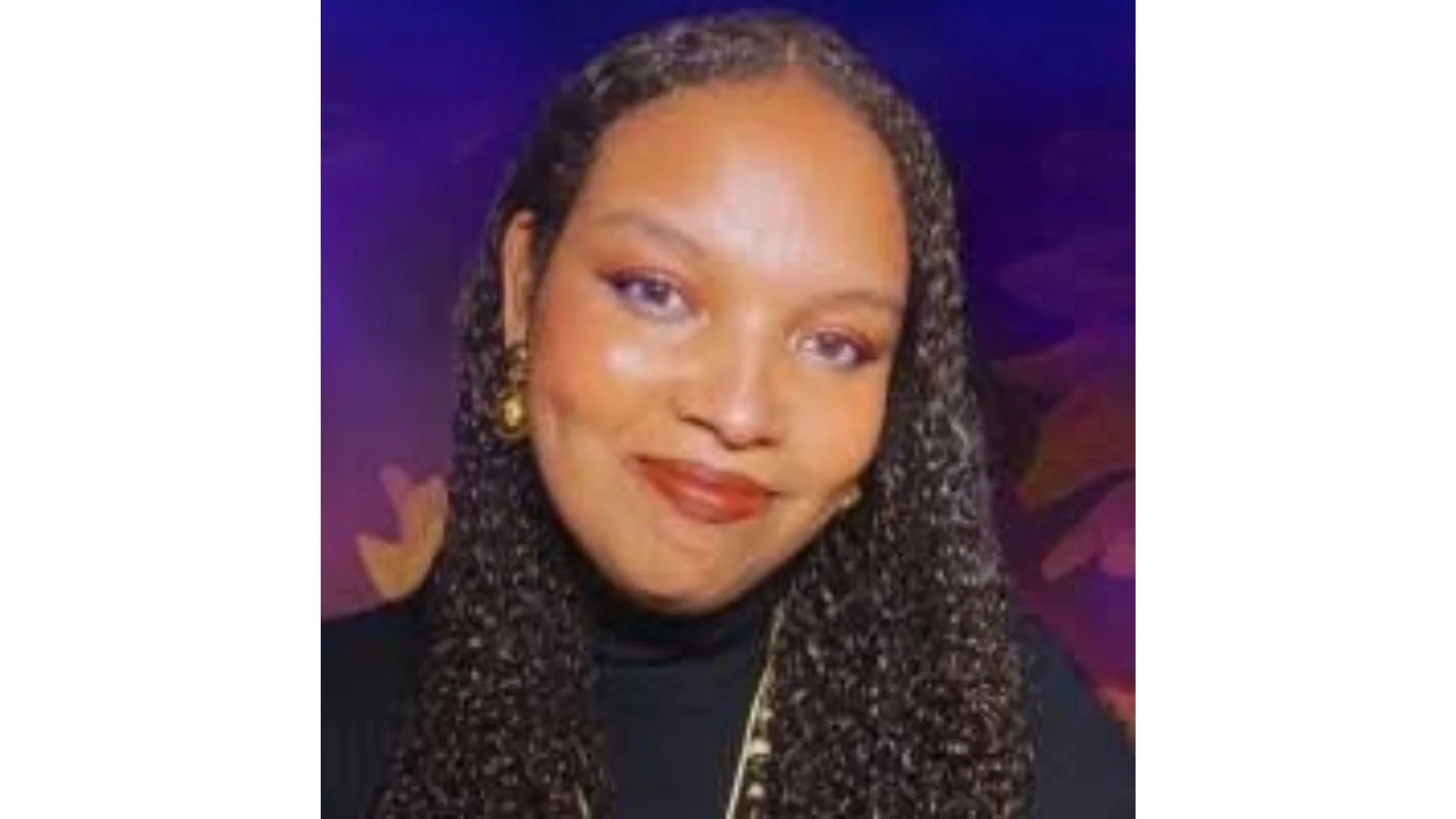 Portrait of a woman with braided hair, wearing earrings, with makeup, smiling, with a blurred colorful background. She is a UI & UX design artist who graduated from the University of Michigan with a focus on graphic design.
